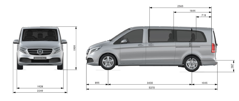 דגם מרצדס V-Class V300 AVANTGARDE 1+6/7 מרצדס V-Class V300 EXCLUSIVE 1+6/7 מרחק סרנים 3,430 3,430 שלוחה קדמית 895 895 שלוחה אחורית 1,045 1,045 אורך כללי 5,370 5,370 רוחב כללי 1,928 1,928 גובה פנימי 1,297 1,297 גובה כללי 1,957 1,957 גובה דלת הזזה 1,220 1,220 רוחב דלת הזזה 837 837