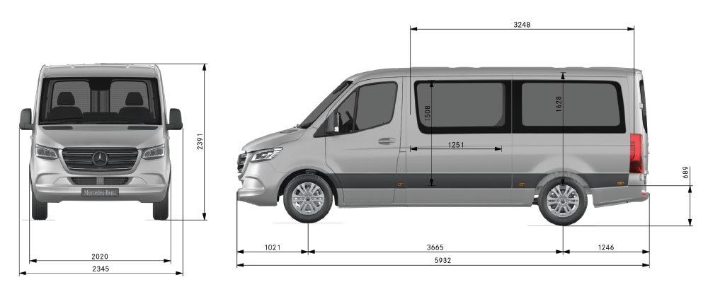 דגם מרצדס ספרינטר 215 קצר נמוך מונגש מרחק סרנים 3,665 קוטר סיבוב (מטר) 12.4 שלוחה קדמית 1,021 שלוחה אחורית 1,246 אורך כללי 5,932 רוחב כללי 2,020 גובה פנימי 1,628 גובה כללי 2,391 גובה דלת הזזה 1,508 רוחב דלת הזזה 1,251