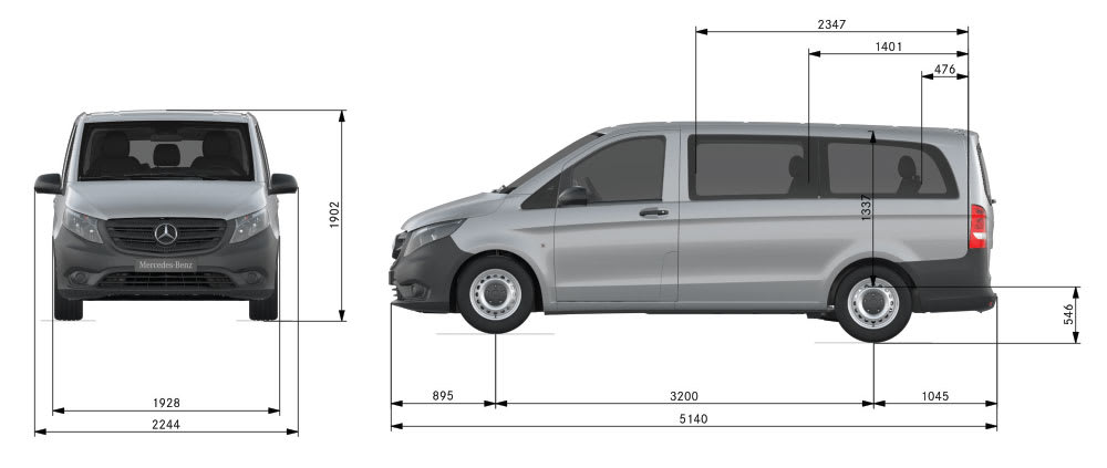 דגם מרצדס ויטו 114 מונגש מרחק סרנים 3,200 שלוחה קדמית 895 שלוחה אחורית 1,045 אורך כללי 5,140 רוחב כללי 1,928 גובה כללי 1,902 גובה פנימי 1,326 גובה דלת הזזה 1,220 רוחב דלת הזזה 837
